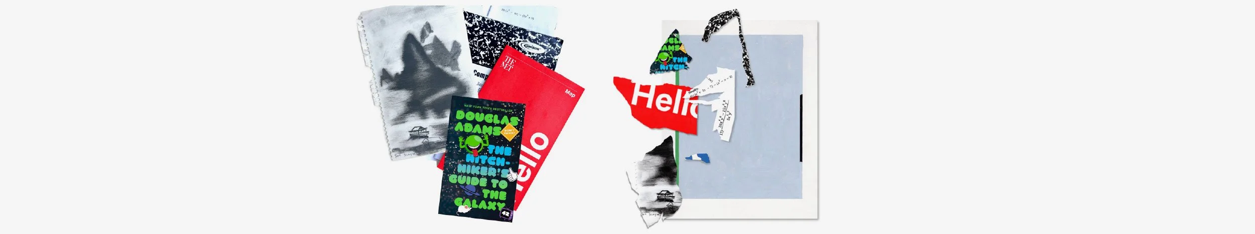 I began by applying gouache paint to the background, then layered cut programs, school projects, drawings, homework assignments, a current book, school stickers, Letraset, and various other scraps onto the canvas. To create unity and cohesion, I used colored pencil to bridge the gaps between these elements. My materials included assorted paper, gouache, colored pencil, scissors, glue, Letraset, ink, a printer, and Photoshop.